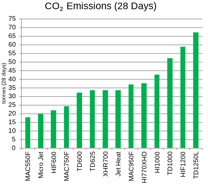 The lowest-emitting heater produces about 18 tonnes, followed by the Micro Jet at 20 tonnes. Jet Heat emits around 34 tonnes, while the highest competitor reaches approximately 67 tonnes over a 28-day cycle.