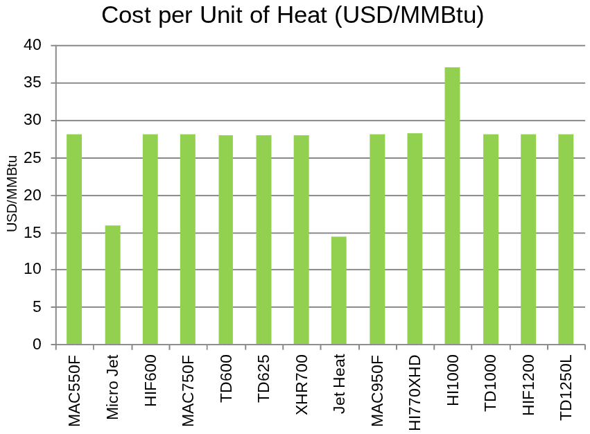 Jet Heat sits just under $15/MMBtu, and Micro Jet slightly above $15/MMBtu. Most traditional heaters cluster around $28/MMBtu, with one outlier (the H1000) at about $37/MMBtu.