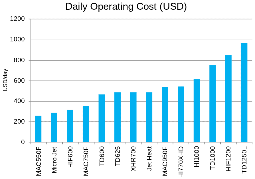 Jet Heat and Micro Jet sit at the lower end of daily operating costs while still delivering consistent, reliable performance. Traditional heaters, by comparison, consume substantially more fuel to produce equivalent heat, which drives their daily costs steadily upward.