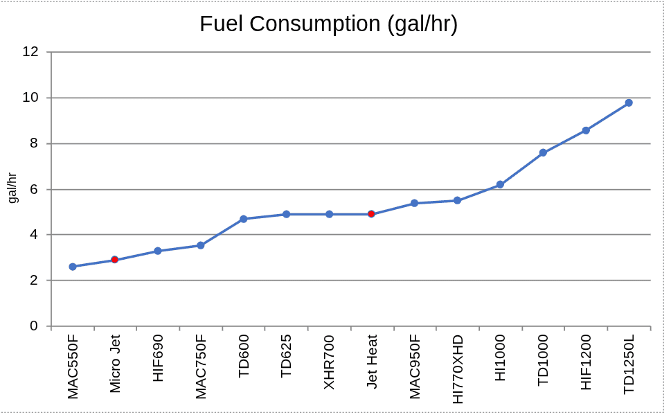 Micro Jet and Jet Heat are among the most fuel-efficient heaters in the comparison. Micro Jet sits just above the lowest-consuming unit, making it one of the best performers for projects where minimizing fuel use is critical. Jet Heat uses slightly more fuel, striking a balance between efficiency and performance.