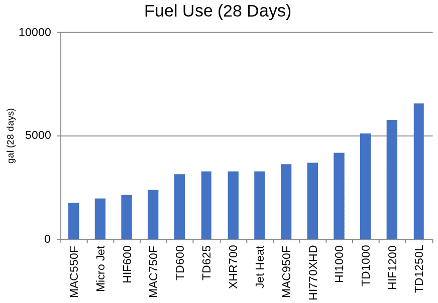In contrast, competitor models show steadily rising consumption, with most falling well above Jet Heat. The TD1250L reaches the top of the chart at roughly 6,250 gallons/28 days.